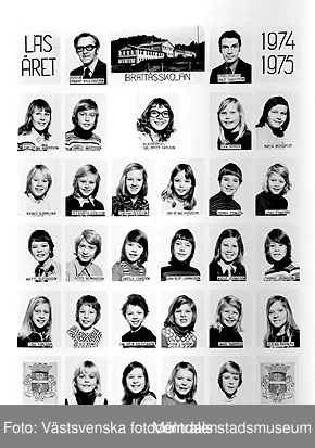 En bildkarta med skolfoton på klass 4B i Brattåsskolan, läsåret 1974/1975. Bildkartan är uppklistrad på ett fotoark i en pärm (MM23916) från Brattås rektorsområde, tillsammans med andra skolfoton MMF2004_1484-1522.