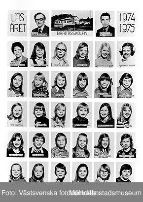 En bildkarta med skolfoton på klass 4A i Brattåsskolan, läsåret 1974/1975. Bildkartan är uppklistrad på ett fotoark i en pärm (MM23916) från Brattås rektorsområde, tillsammans med andra skolfoton MMF2004_1484-1522.