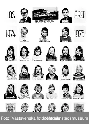 En bildkarta med skolfoton på klass 3C i Brattåsskolan, läsåret 1974/1975. Bildkartan är uppklistrad på ett fotoark i en pärm (MM23916) från Brattås rektorsområde, tillsammans med andra skolfoton MMF2004_1484-1522.