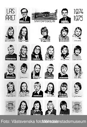 En bildkarta med skolfoton på klass 5G i Sinntorpsskolan, läsåret 1974/1975. Bildkartan är uppklistrad på ett fotoark i en pärm (MM23916) från Brattås rektorsområde, tillsammans med andra skolfoton MMF2004_1484-1522.