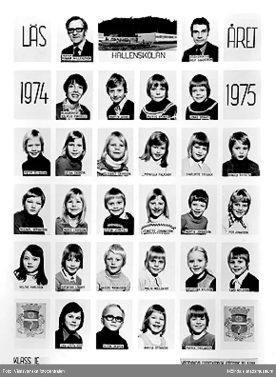 En bildkarta med skolfoton på klass 1E i Hallenskolan, läsåret 1974/1975. Bildkartan är uppklistrad på ett fotoark i en pärm (MM23916) från Brattås rektorsområde, tillsammans med andra skolfoton MMF2004_1484-1521.