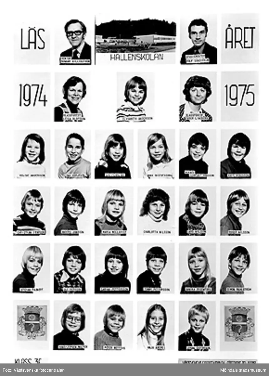 En bildkarta med skolfoton på klass 3E i Hallenskolan, läsåret 1974/1975. Bildkartan är uppklistrad på ett fotoark i en pärm (MM23916) från Brattås rektorsområde, tillsammans med andra skolfoton MMF2004_1484-1522.