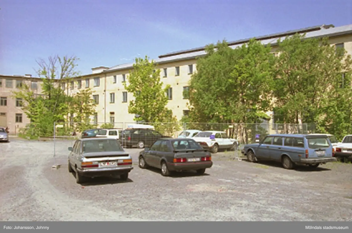 Vy från parkeringsplatsen "Brända tomten" på f.d strumpfabriken "Strumpan" (efter Viktor Samuelsons fabrik), år 2000.