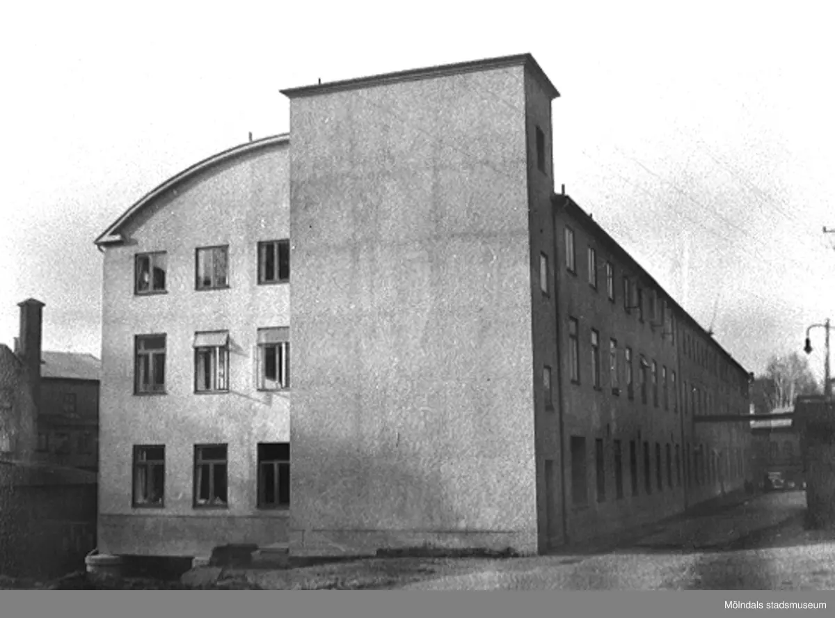Vy österifrån på Viktor Samuelsons fabrik "Strumpan", omkring 1940. Till vänster om byggnaden rinner forsen och till höger Kvarnbygatan.