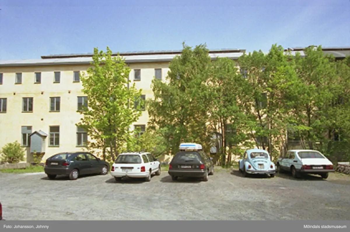 Vy från parkeringsplatsen "Brända tomten" på f.d strumpfabriken "Strumpan" (efter Viktor Samuelsons fabrik), år 2000.