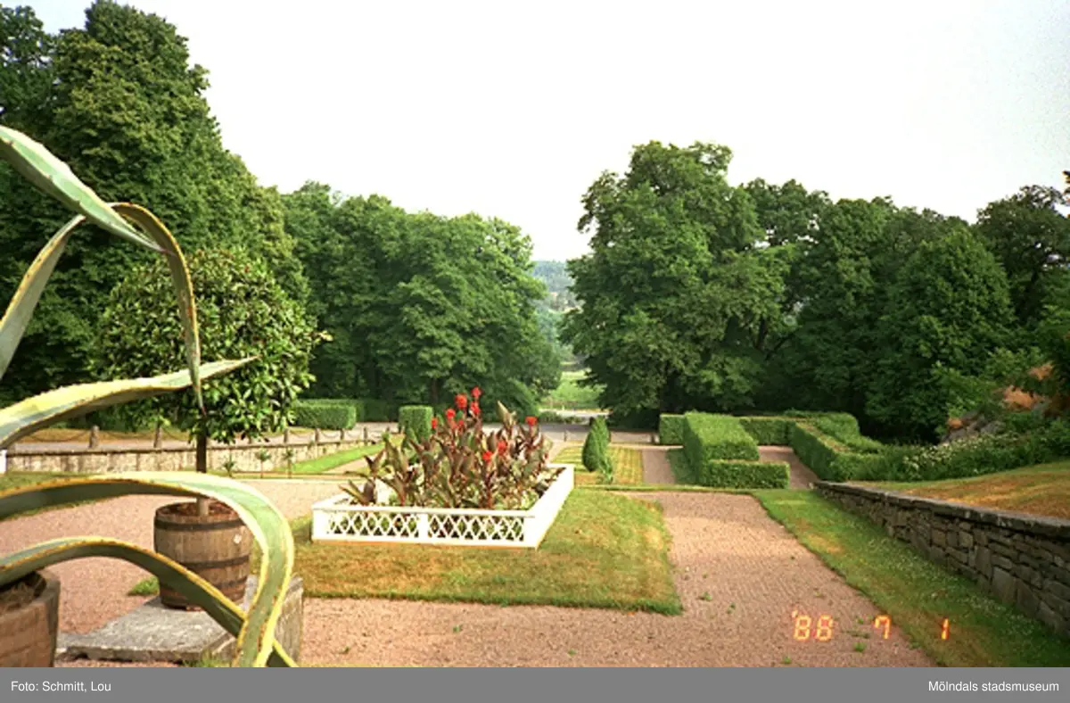 En del av parken vid Gunnebo slott. Man ser växtlighet och rabatter samt träd i bakgrunden.