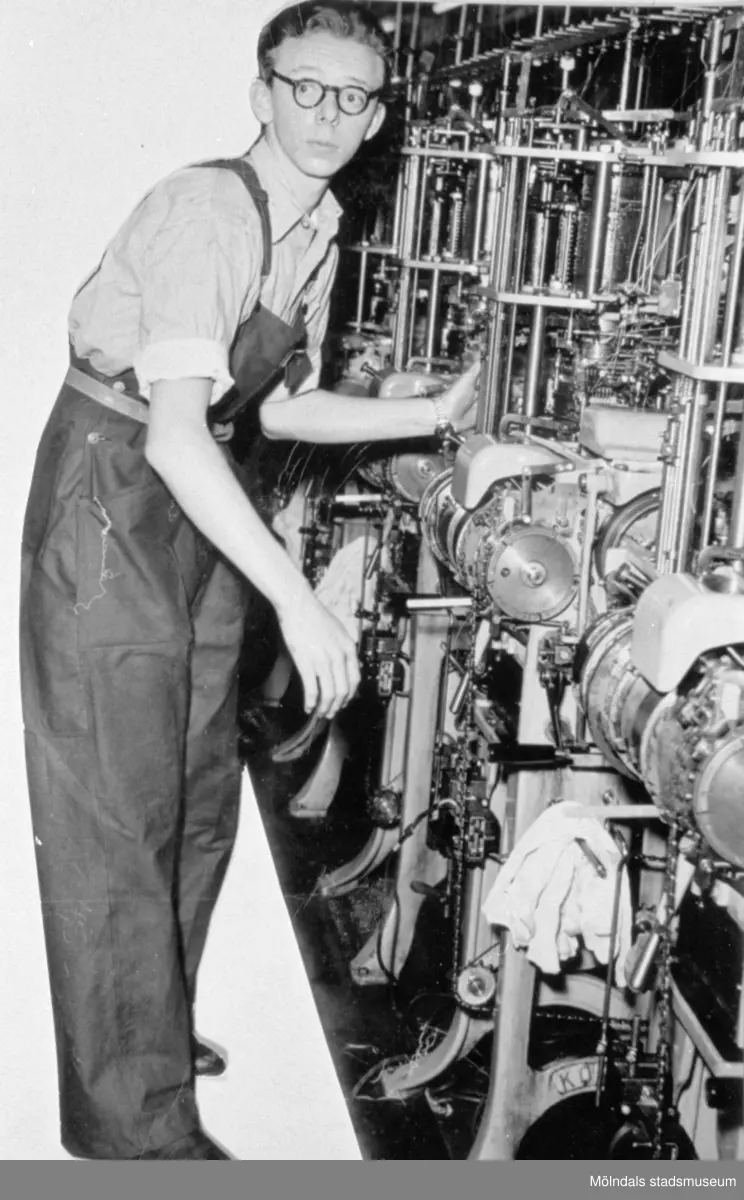 Bengt Andersson (1932-2013) arbetar vid en stickmaskin på Viktor Samuelsons fabrik "Strumpan", ca 1950-tal. Bengt blev senare engagerad i Föreningsarkivets (i samma byggnad) verksamhet.