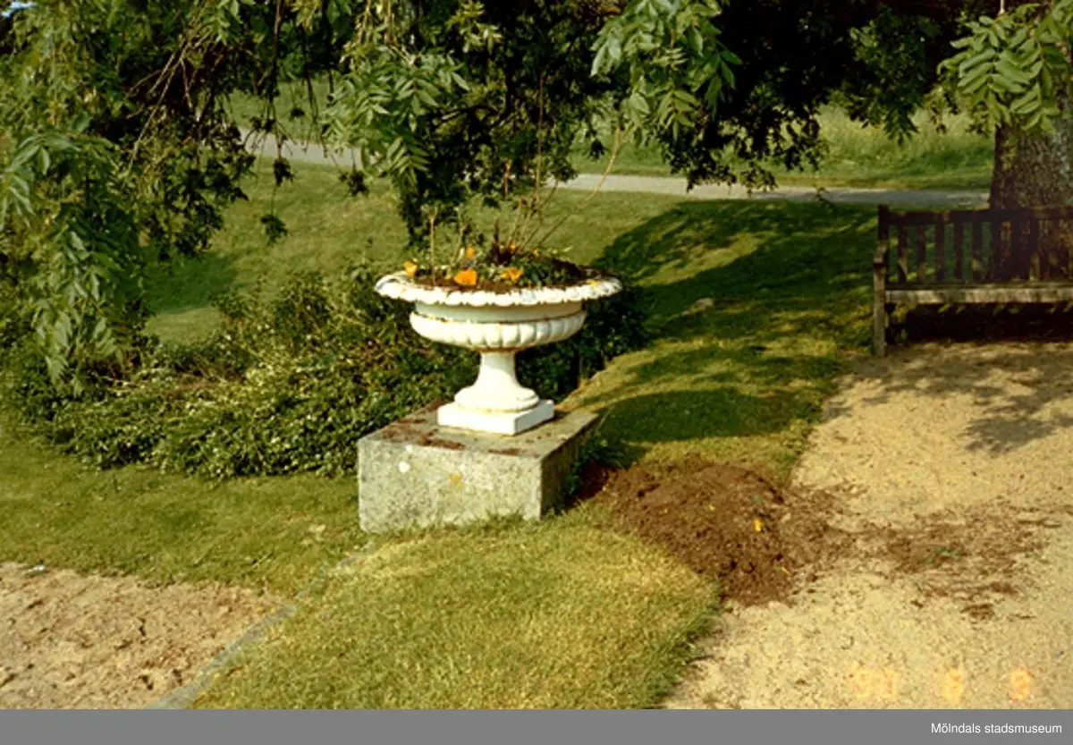 En krukväxt, som står på gräset i trädgården. Gunnebo slott, juni 1990.