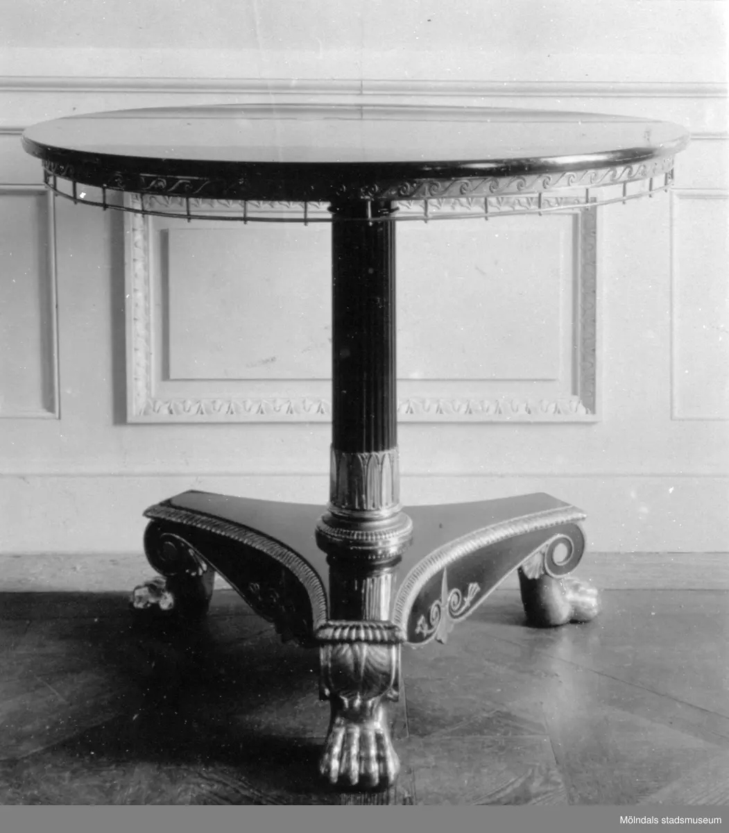 Runt, mindre bord ståendes vid en inomhusvägg. I bakgrunden ser man väggdekor. Gunnebo slott 1930-tal.