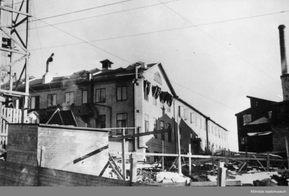 Viktor Samuelsons fabrik "Strumpan" sedd från forssidan, cirka 1940. Fabriken byggdes ut 1941-1945 och Kvarnfallet 13 revs.
