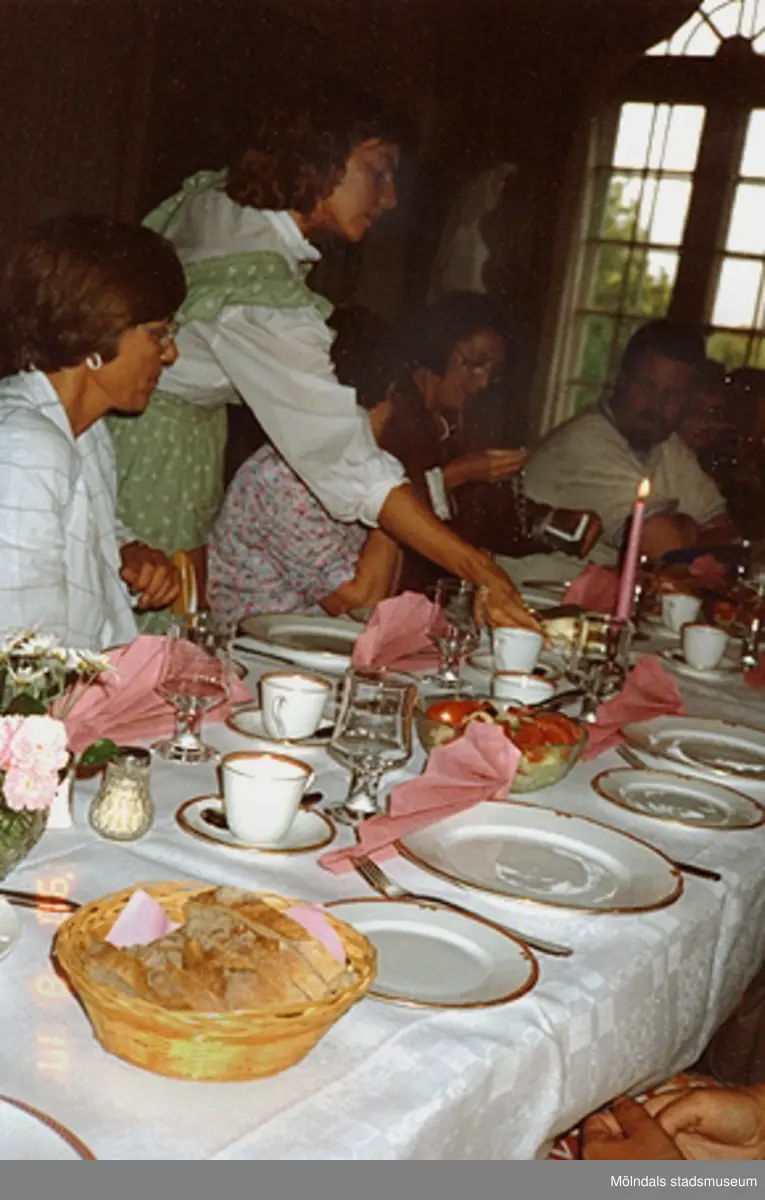 Uppdukat bord, serveringspersonal och gäster vid en fest på Gunnebo slott, augusti -90.