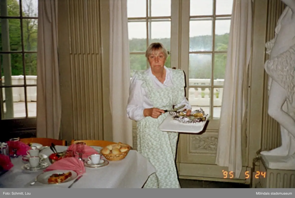 En kvinna som dukar ett bord inomhus på Gunnebo slott. I bakgrunden ses södra sidan samt en staty, maj 1995.