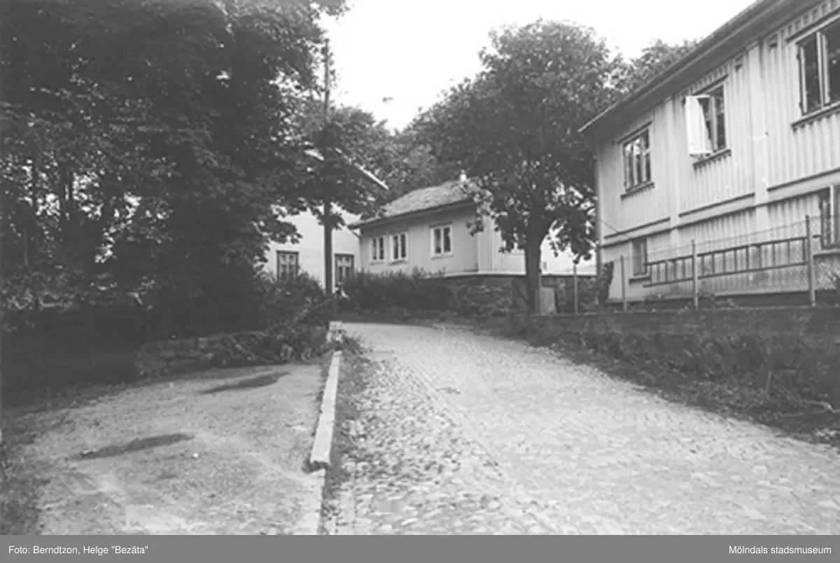 Klippgatan (Royens gata) i Mölndals kvarnby, 1984. "I det lilla huset i mitten av bilden hörde och såg jag den första grammofonen med stor tratt och raspig musik. Måste ha varit 1917-18", enligt Berndtzons anteckningar.