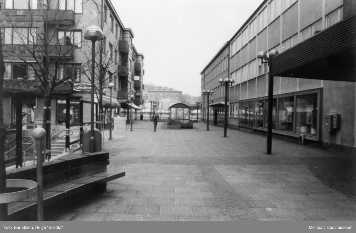 Till vänster, längst ner mot Göteborgsvägen, ses Brogatans äldsta stenhus Centrumhuset, 1980-tal. Till höger ligger gamla Hantverkshuset med bank och post. Gatan hette då Frölundagatan.