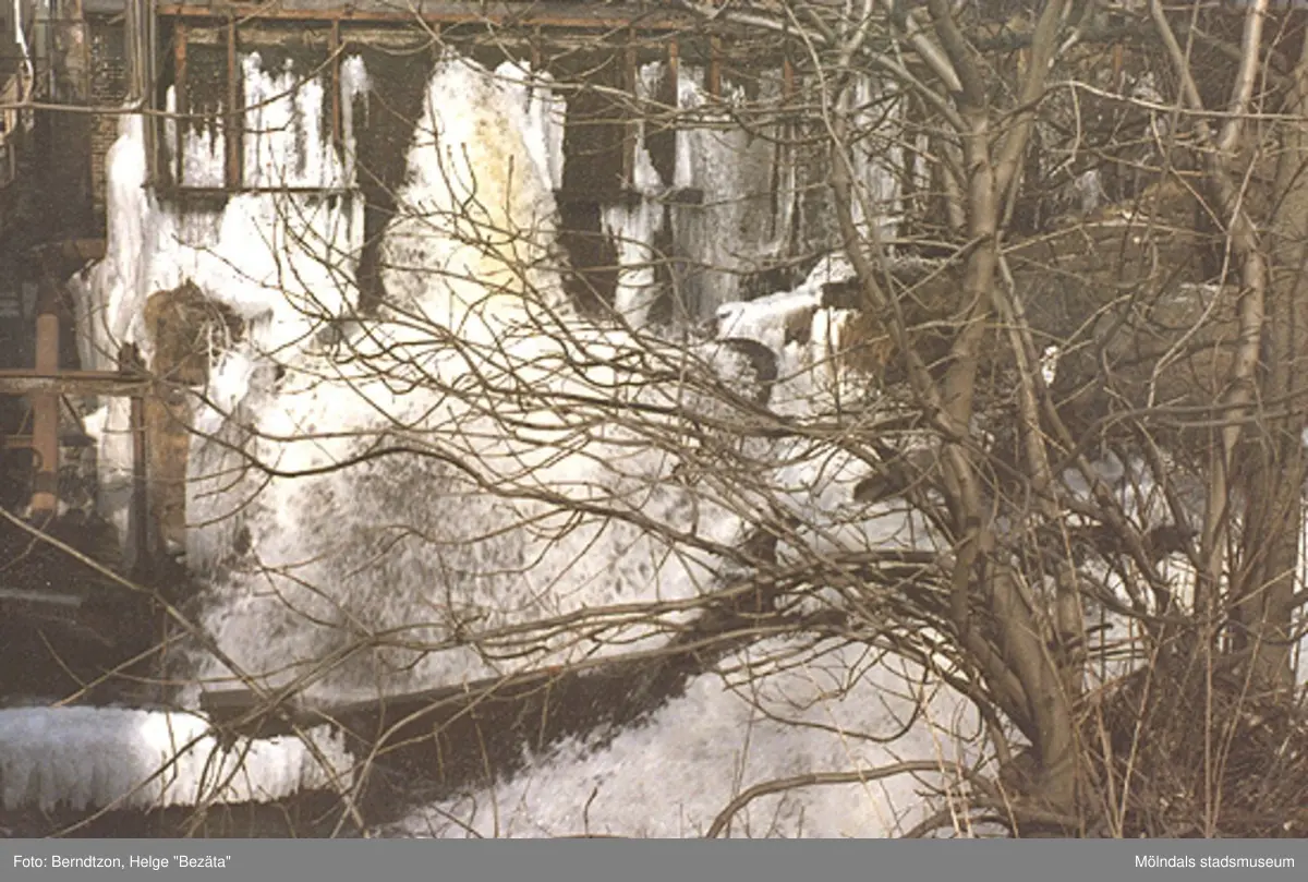 Mycket is i vattenrännorna vid Mölndalsfallen vintertid. Årtal okänt.
