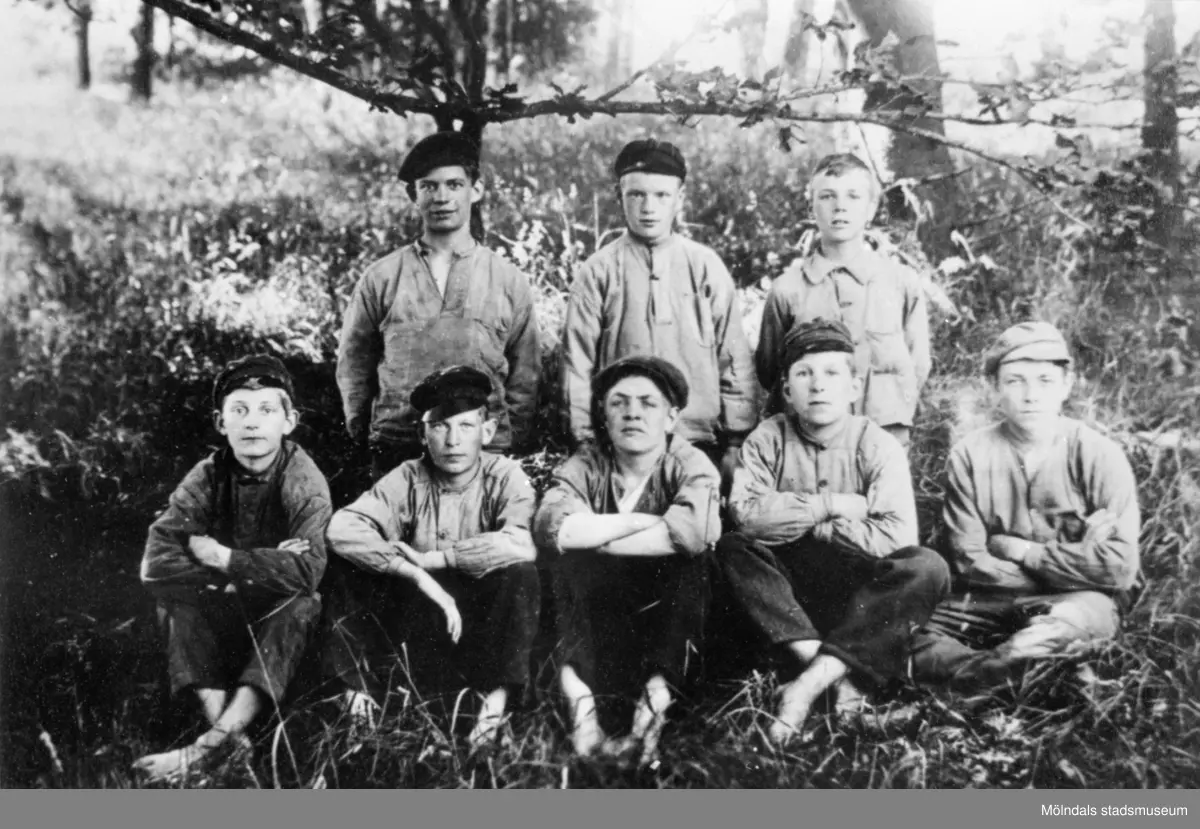 "Spinnpojkar" sitter i fabriksparken vid Anderstorps fabrik (August Werner), 1919-1920. Överst fr v: Bruno Bengtsson, Folke Norén, Ernst Nilsson. Nedre fr v: Eskil Bodlund, Elis Andersson, Gustav Svensson-Ek, Joel Zachrisson och Gunnar Rasmusson.