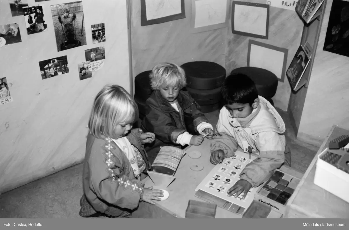 Tre barn sitter på golvet och leker med föremål från museet. Utställningsvernissage av och om Katrinebergs daghem på Mölndals museum 1993-09-10.