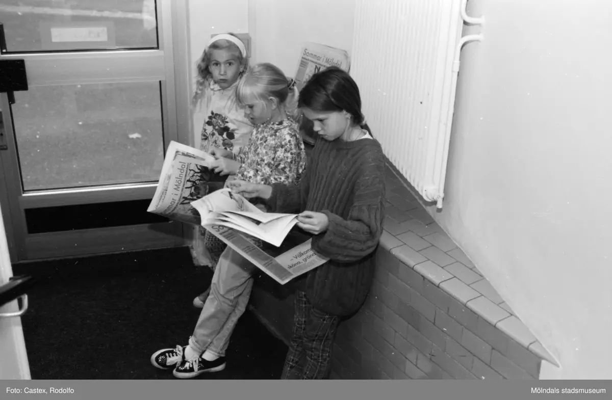 Tre flickor står lutade mot en entrévägg och läser tidningar. Utställningsvernissage av och om Katrinebergs daghem på Mölndals museum 1993-09-10.