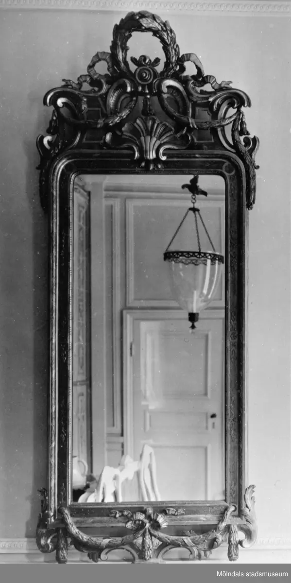 Vägghängd avlång spegel med dekor. I spegelglaset ses delar av ett rum med enkeldörr och taklampa. Gunnebo slott 1930-tal.