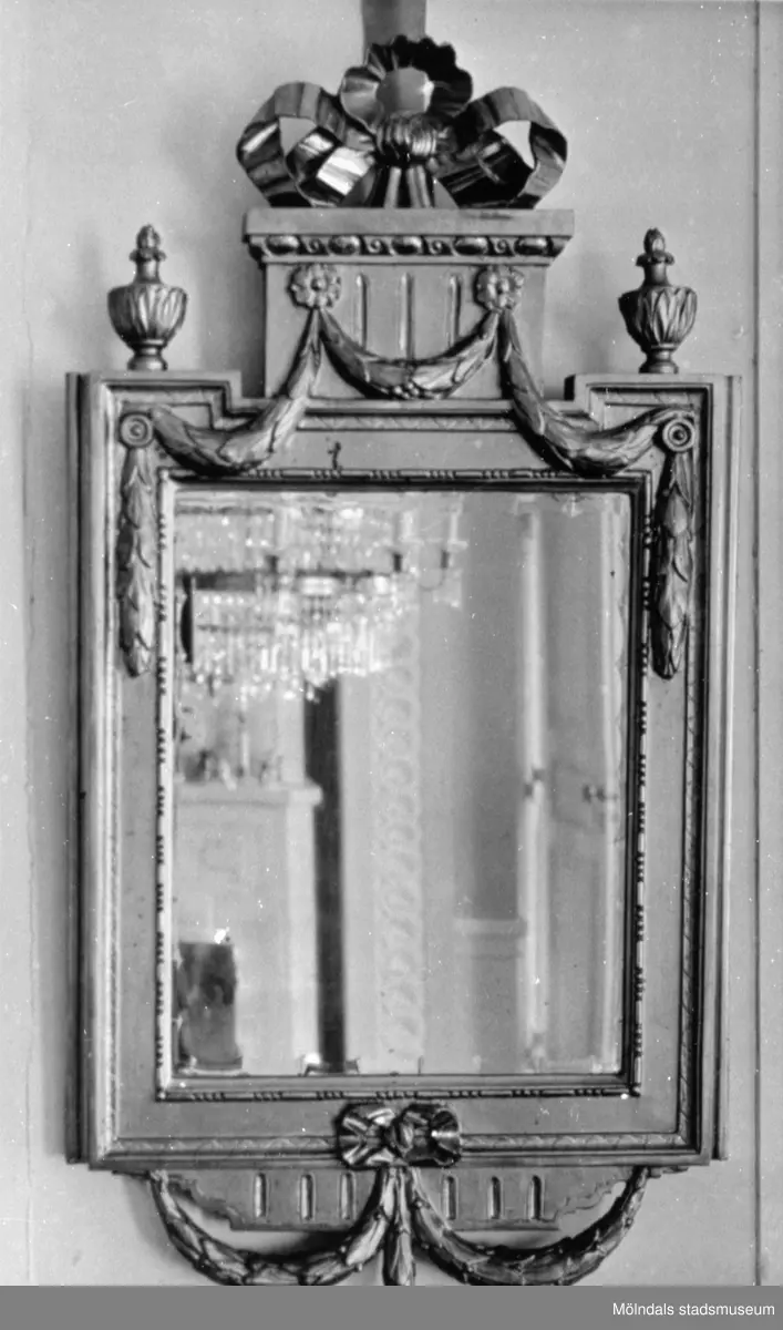 Vägghängd, avlång träspegel med dekor. I spegelglaset ses delar av ett rum samt med kristallkrona. Gunnebo slott 1930-tal.