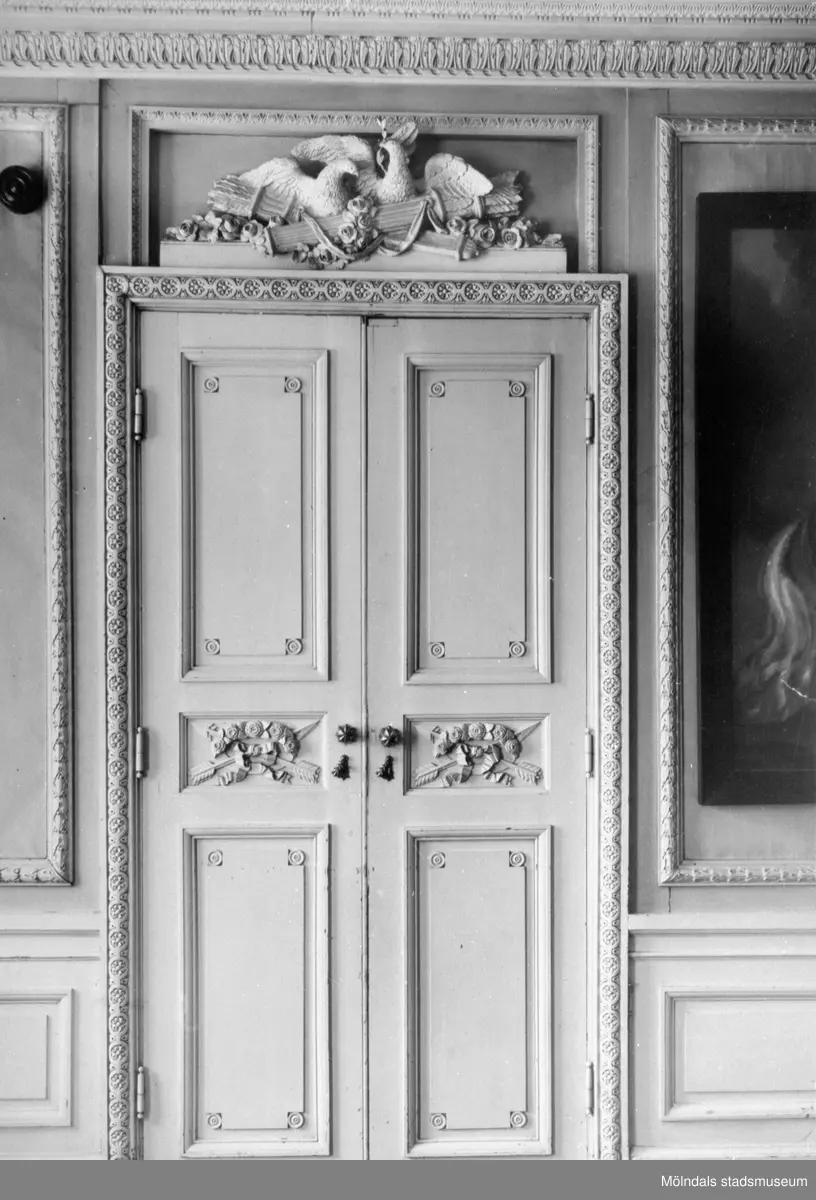 Dubbeldörr med två fåglar i relief ovanför i fru Halls (Christina Hall, 1749–1825) sängkammare. Gunnebo slott, 1930-tal.