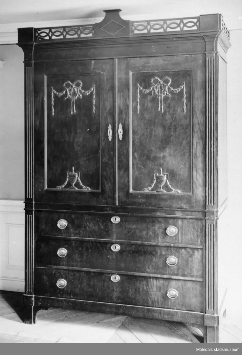 Högt byråskåp i mörk färg med mässingsbeslag, överdel med två stängda luckor och tre lådor nertill. Gunnebo slott 1930-tal.
