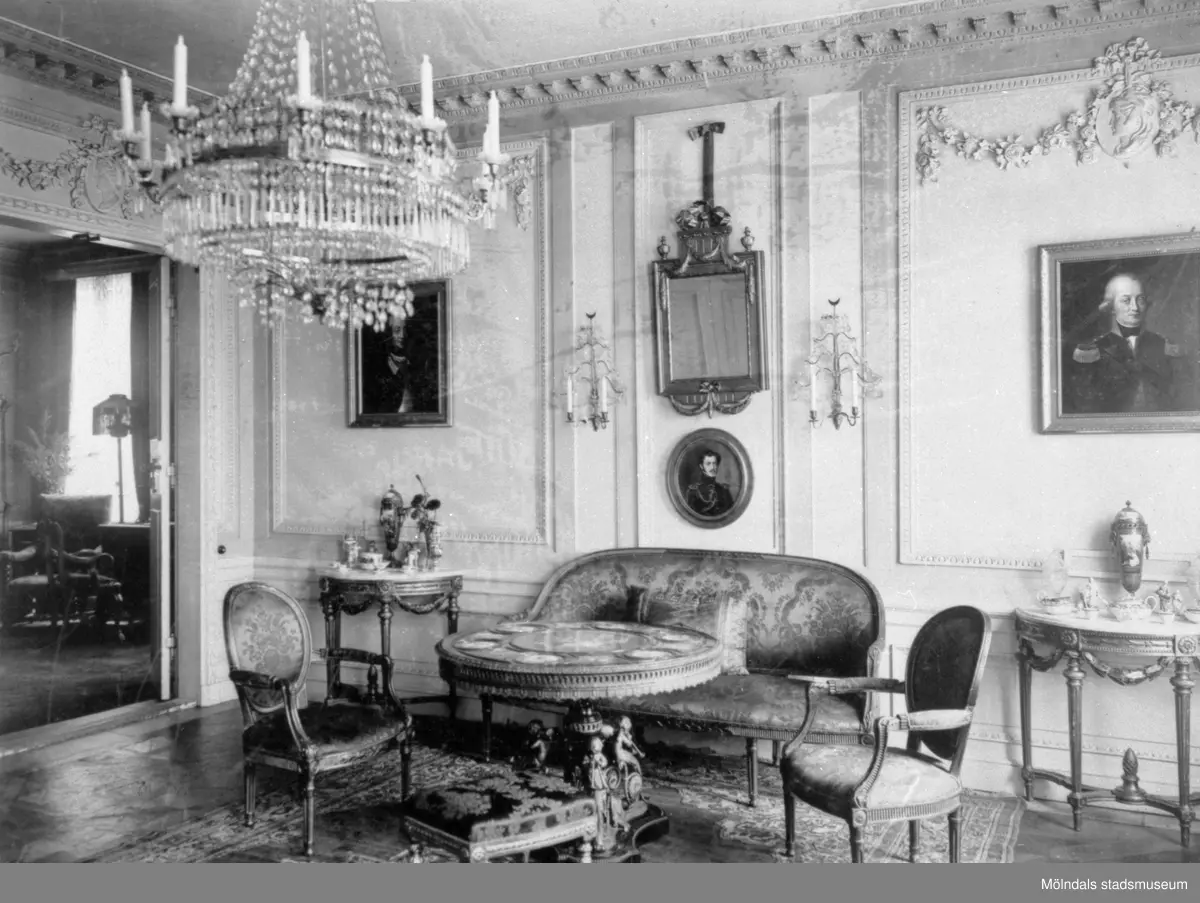 Möblerat rum (förmaket till fru Halls sängkammare) med takkrona som har slipade kristallprismor och plats för ljus. Det lilla runda porträttet i mitten är Kung Oskar I (1799-1859). Gunnebo slott 1930-tal.