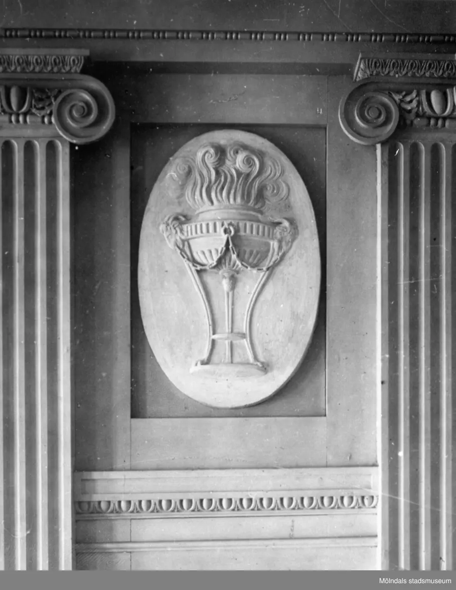 I en tablett, en stående oval relief med emblemet "flammor ur en trefot", placerad ovanför årstids-gipsfiguren "Vintern" av Gioacchino Frulli (1766-1801). Denna sitter på nordvästra väggen i stora salongen på Gunnebo slott.