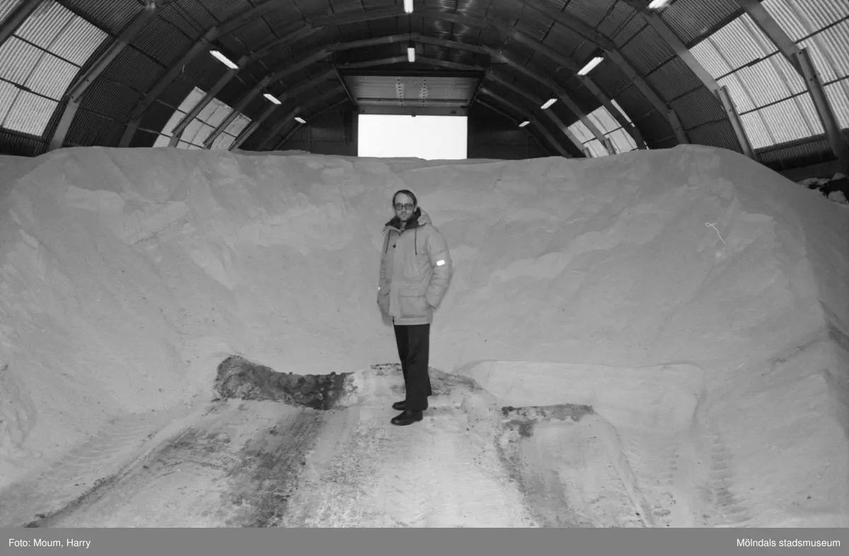 Gatukontorets centralförråd vid Skedebrogatan i Mölndal, år 1985. "Förrådschef Gunnar Wigén i "saltlådan" där det förvaras hundratals ton salt, flis och sand."