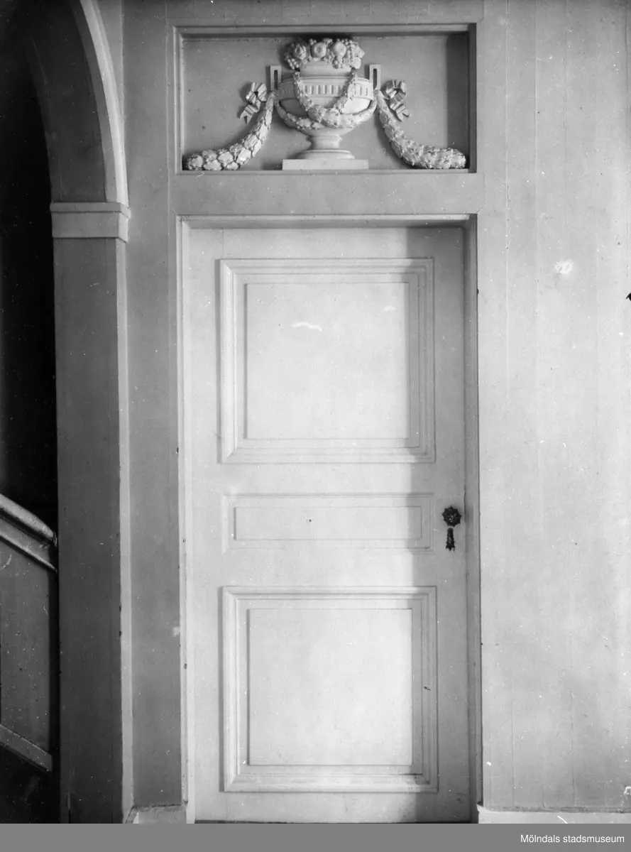 Enkeldörr med relief ovan som är en fruktskål av trä. Dörren går mellan Dégagementet och Östra förstugan i huvudvåningen på Gunnebo slott.