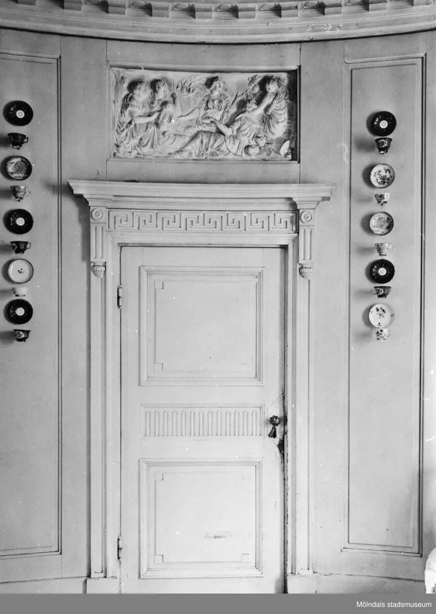 Utsmyckad enkeldörr med relief ovan. På båda sidor om dörren hänger koppar och fat av porslin. Gunnebo slott, 1930-tal.