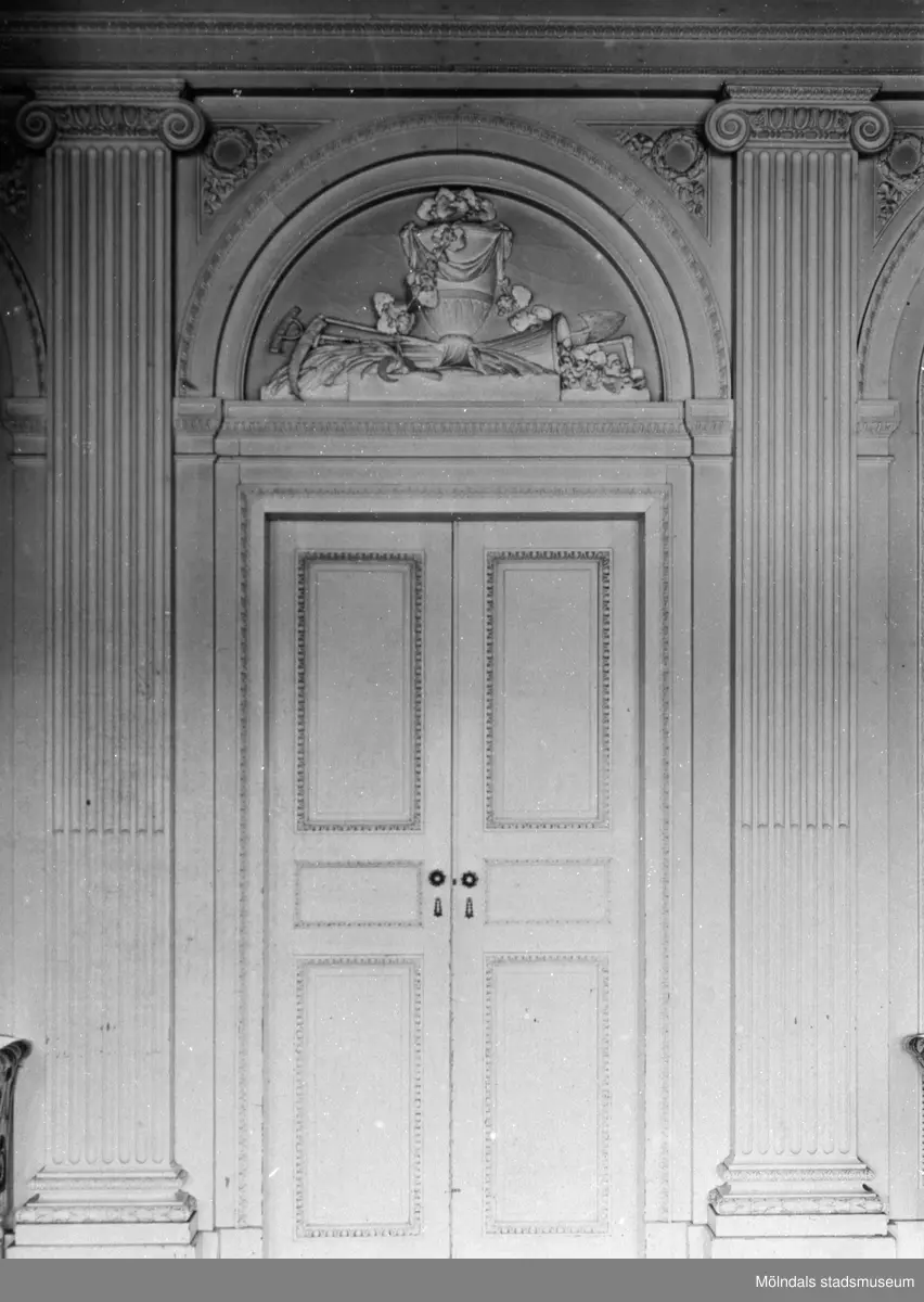 Dubbeldörr, mellan Salongen och Ovala vestibulen, med relief i halvcirkel ovanför. Reliefen föreställer en pokal med skäror och trädgårdsverktyg. Gunnebo slott 1930-tal.