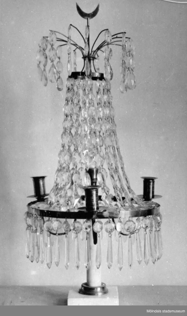 Gustaviansk lyster med slipade kristallprismor och marmorsockel med plats för fyra ljus. Gunnebo slott, 1930-tal.