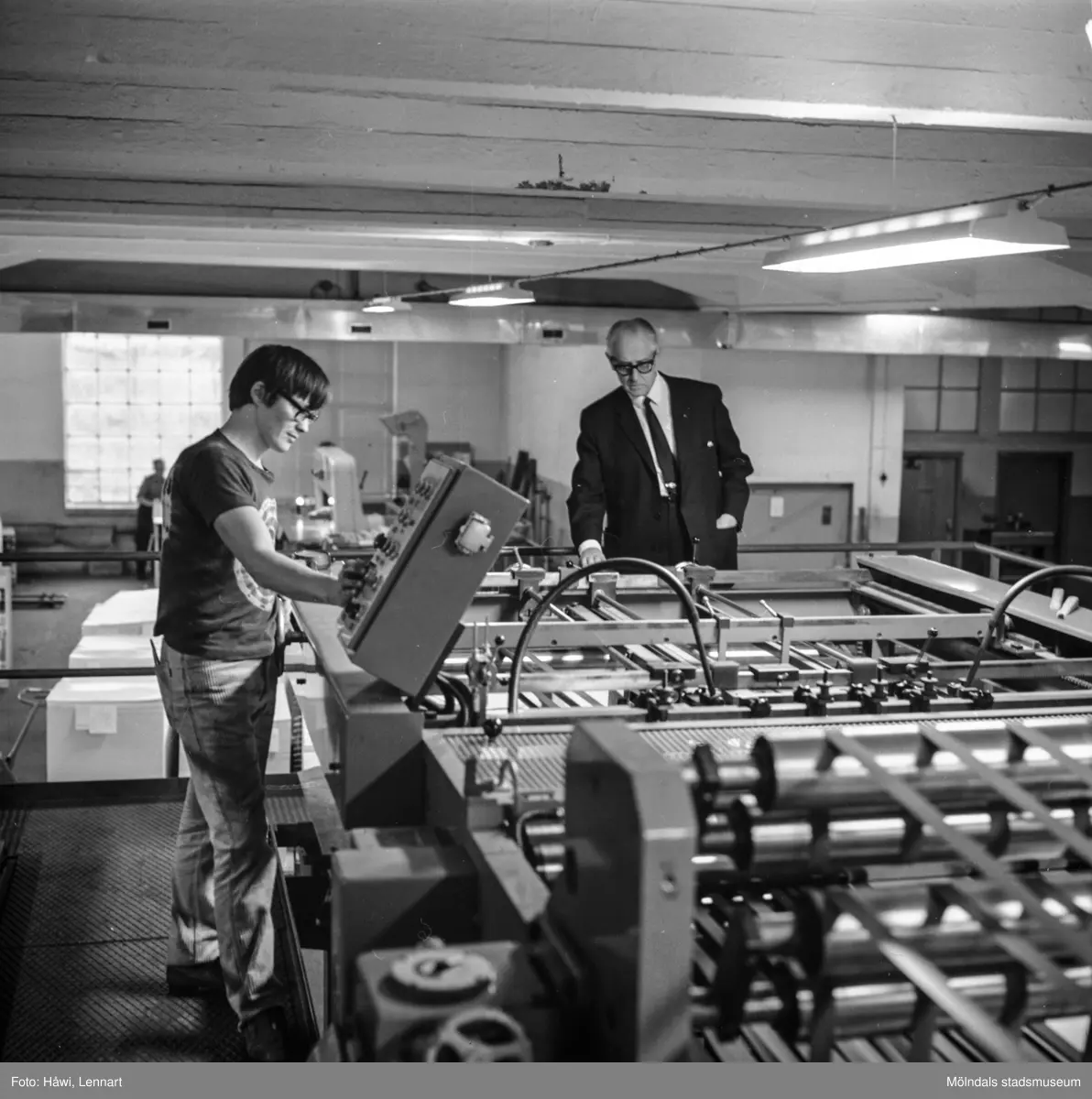 Papyrus direktör William Tibell och en fabriksarbetare står vid maskin på pappersbruket Papyrus i Mölndal, 14/12 1970.