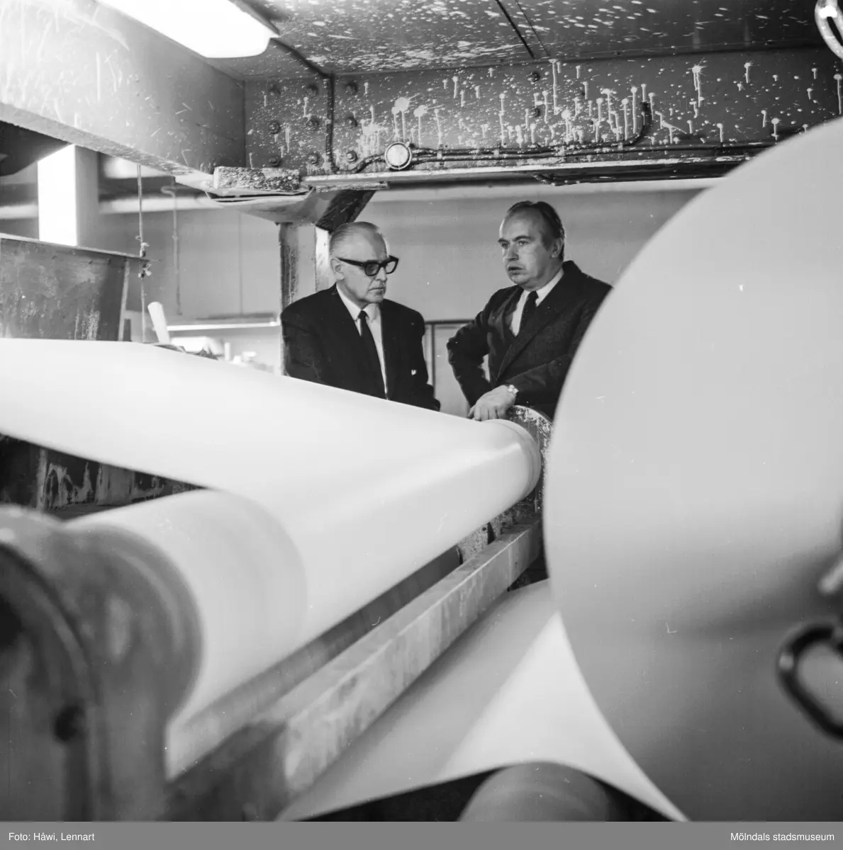 Pappersbruket Papyrus direktör William Tibell och en annan man står vid maskin på Papyrus i Mölndal, 14/12 1970.
