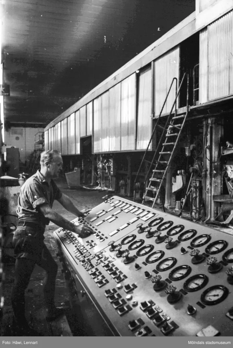 Man i arbete vid maskin på pappersbruket Papyrus i Mölndal, hösten 1970. Manöverpanel till PM 5, byggnad 9. Maskinen kom 1965. Mannen på bilden är Jörgen Jörgensen.