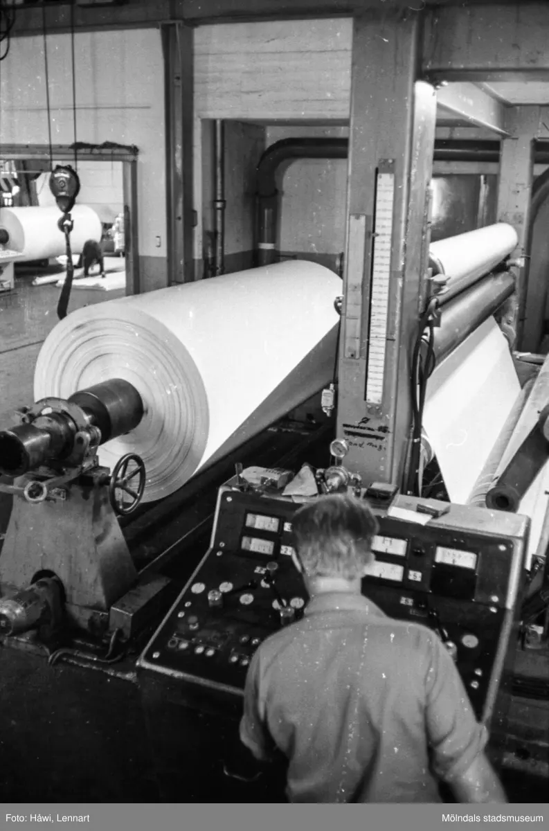 Mannen på bilden är arbetsledare Lars Elfström i arbete vid maskin, RM 5. I bakgrunden syns maskin Glätt 5. Pappersbruket Papyrus i Mölndal, hösten 1970.