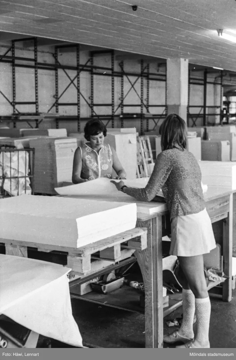 Kvinnor i arbete med risbindning av papper. Ett ris är en måttenhet som används vid paketering av papper - det anger antalet ark i papperspaketet. Det vanligaste är 500 ark. Pappersbruket Papyrus i Mölndal, hösten 1970.