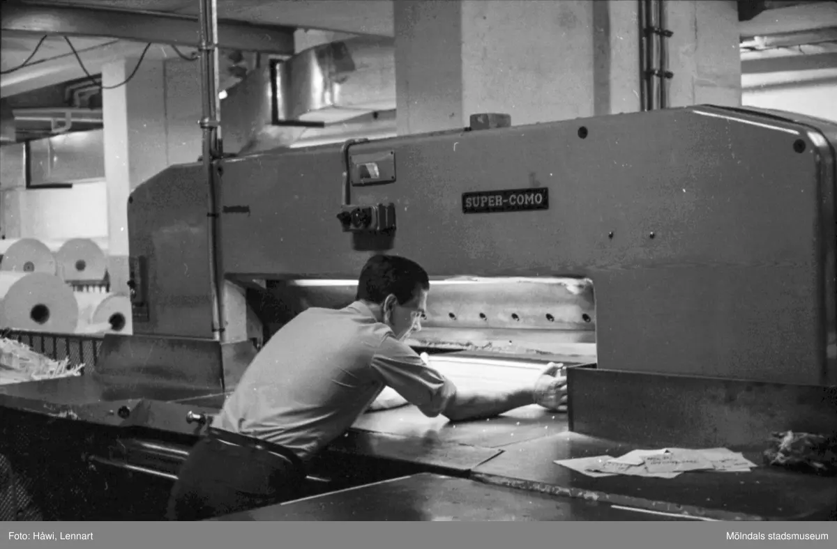 Man i arbete vid skärmaskin på pappersbruket Papyrus i Mölndal, hösten 1970. Renskärning av papper för att få exakta mått. Anställda på Papyrus kallade skärmaskinen "giljotinen".