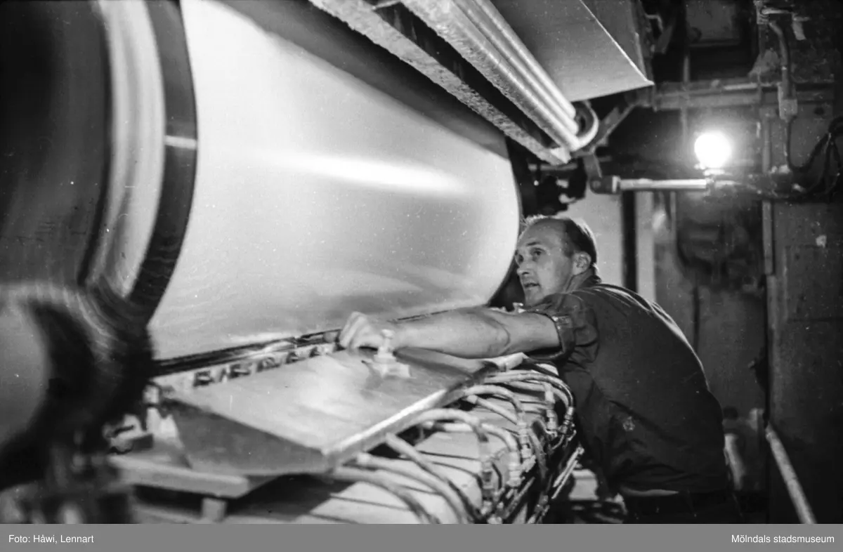 Jörgen Jörgensen i arbete vid maskin, PM 5. Bladbestrykning - en bestrykningsmassa stryks över pappret för att fylla ut porerna i papperet. Det ökar papperets tryckbarhet. Smeten var t ex kaolin (porslinslera). Pappersbruket Papyrus, hösten 1970.