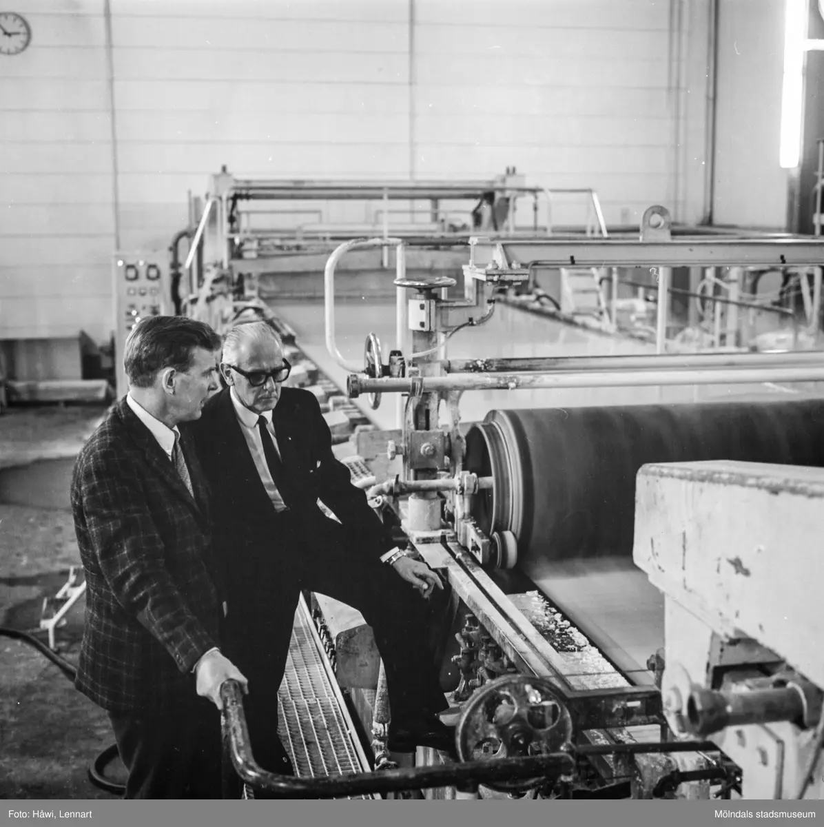 Papyrus direktör William Tibell och en annan man står vid pappersmaskin på pappersbruket Papyrus i Mölndal 14/12 1970.