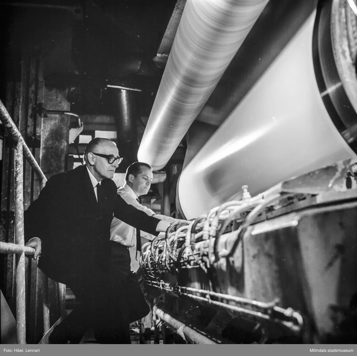 Papyrus direktör William Tibell och ingenjör Åke Severed vid PM5:s bladbestrykningsstation på pappersbruket Papyrus i Mölndal, 14/12 1970.