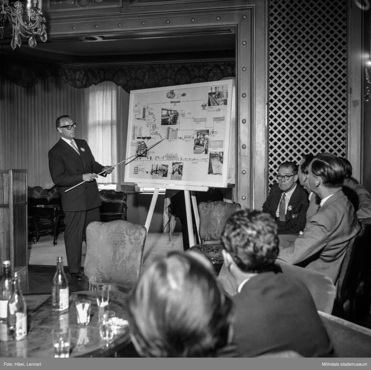 Reportage från pappersbruket Papyrus pressvisning i Mölndal, 29/8 1955. Mannen med pekpinnen är William Tibell, fabrikschef.
