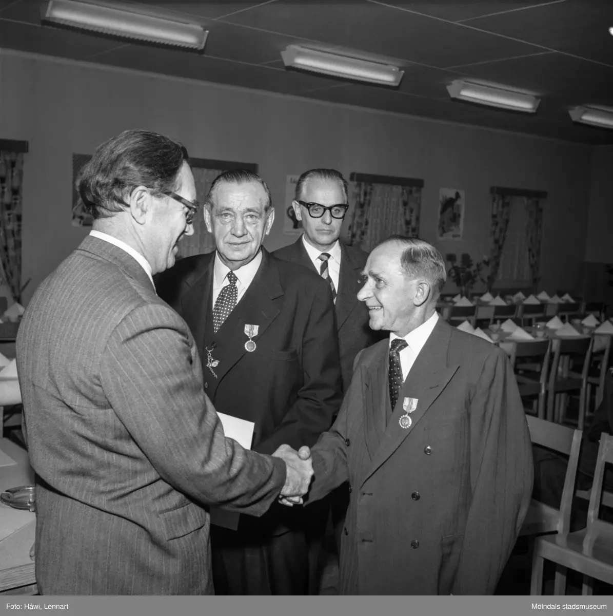 Pappersbruket Papyrus i Mölndal, 13/11 1957. Föreningen för arbetarskydds guldmedalj utdelas till Nils Nilsson och Carl Nygren.