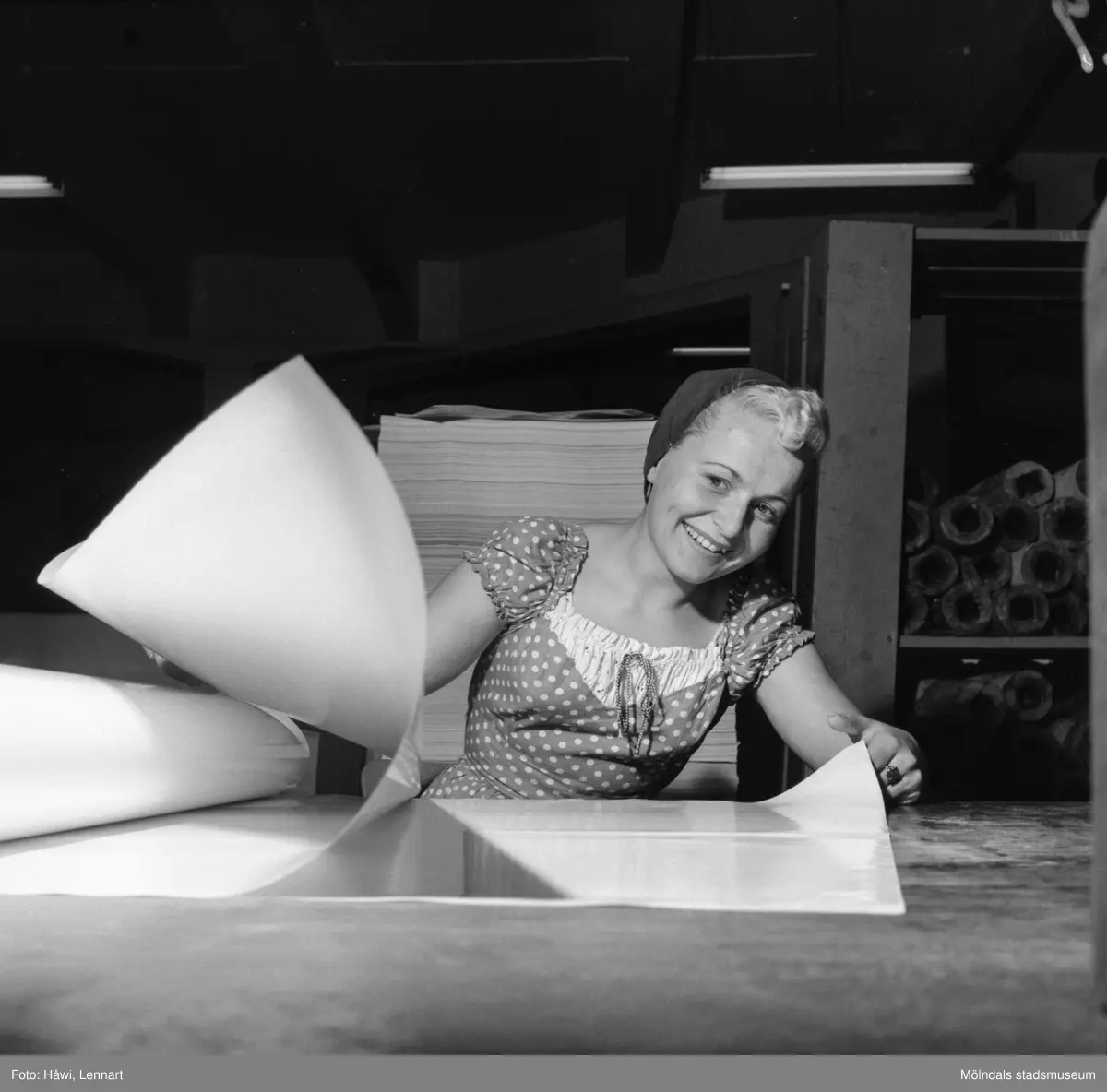 Daily Rönnblad i arbete i sortersalen på pappersbruket Papyrus i Mölndal, 6/5, 1955. Fotot hängdes bredvid rulltrappan vid norra portens entré till området. Daily kom därför att kallas "Miss Papyrus". Daily arbetade på Papyrus under 1950-talet och början av 1960-talet. Flyttade sedan till Skoghall.