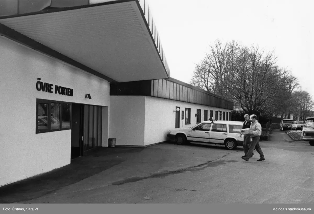 Kent-Erik Pettersson och Jan Callesen på väg mot övre porten till pappersbruket Papyrus vid Kvarnbygatan i Mölndal, år 1990.