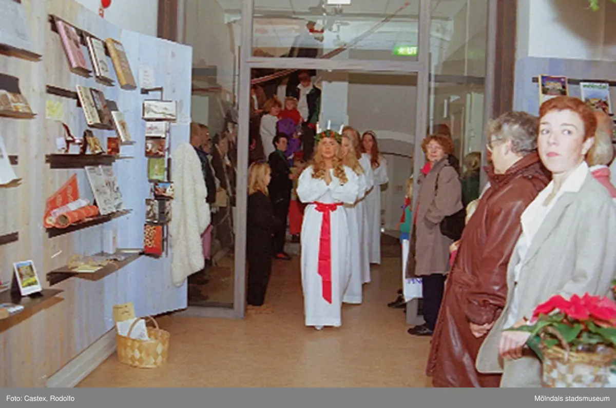 Julmarknad på Mölndals museum 1994-12-04. Luciatåg på ingående. Till höger i bild står museets antikvarie Ulla Hasselqvist.