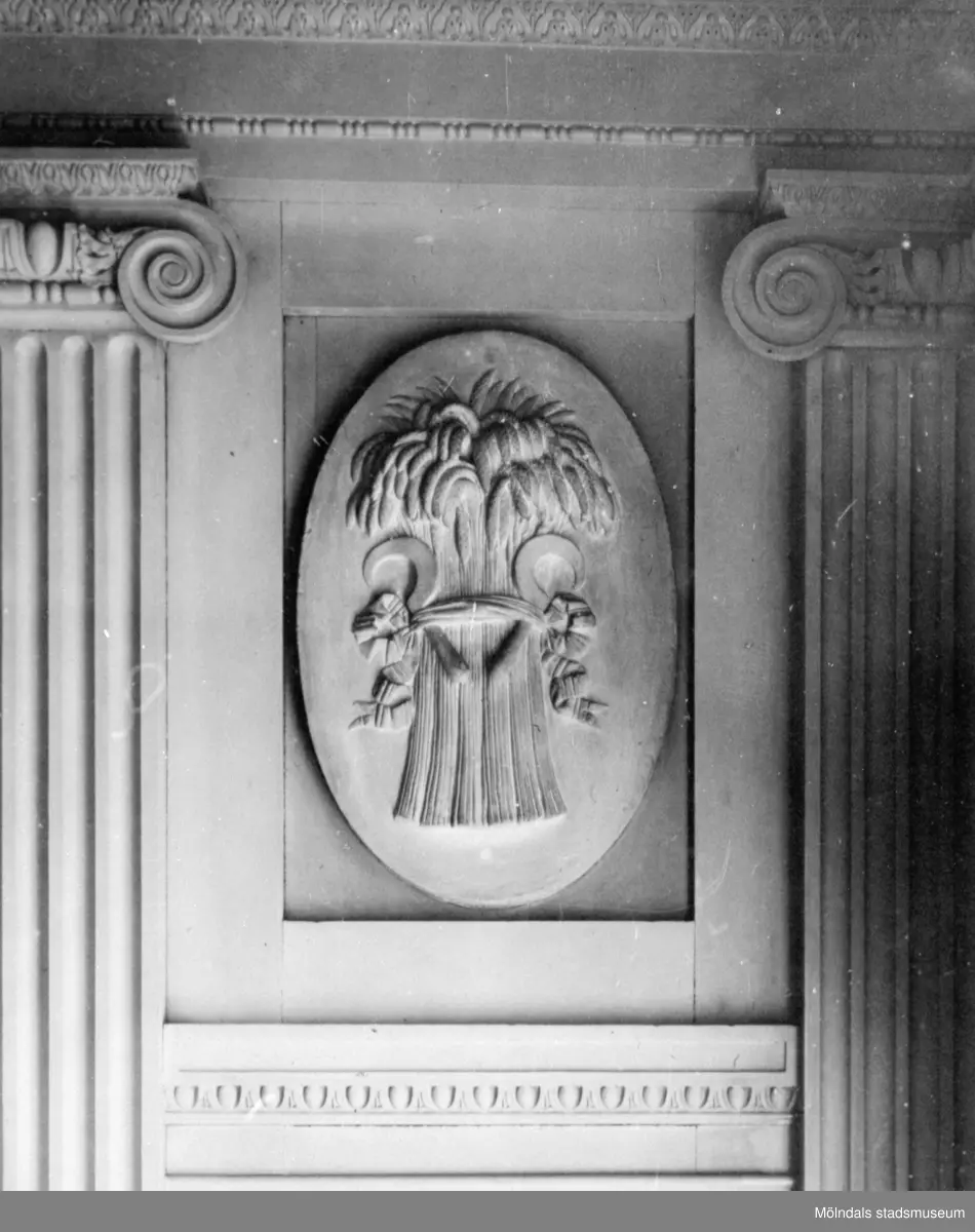 I en tablett, en stående oval relief med emblemet "vase med skära", placerad ovanför årstids-gipsfiguren "Sommaren" av Gioacchino Frulli (1766-1801). Denna sitter på sydöstra väggen i stora salongen på Gunnebo slott.