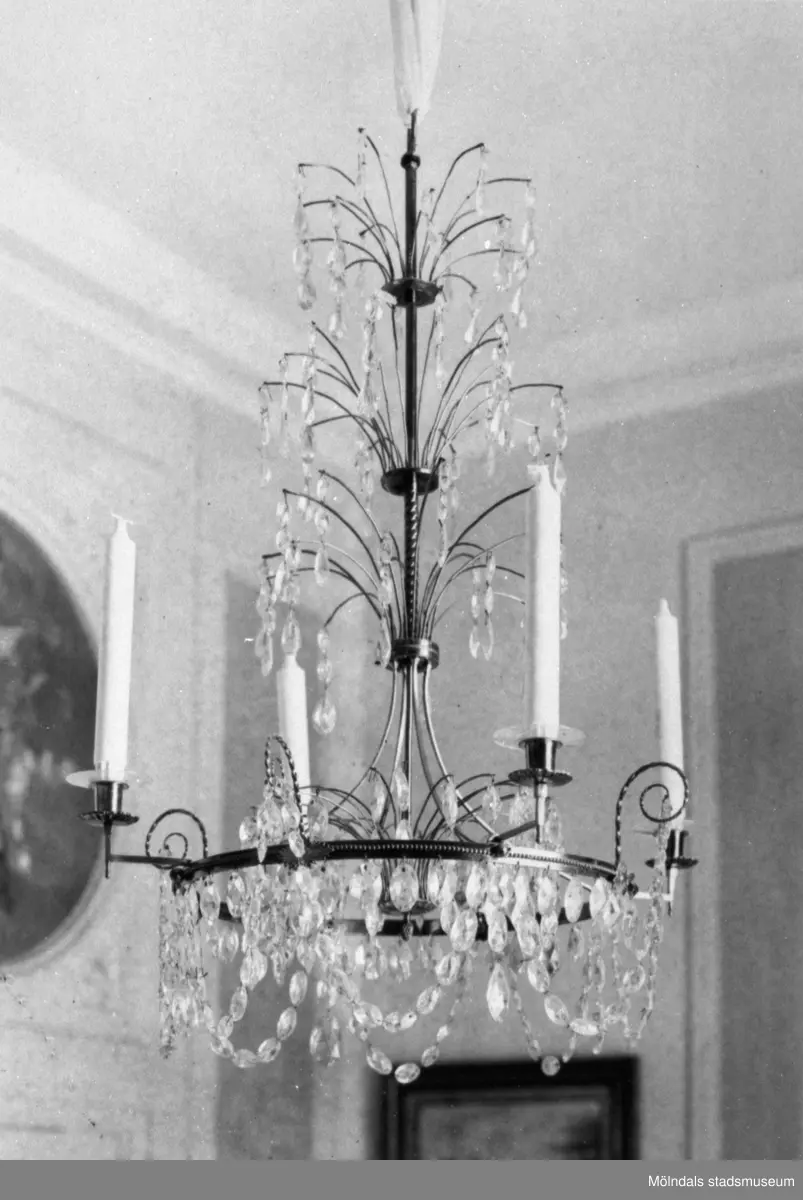 Takkrona med slipade kristallprismor och plats för fyra ljus. Gunnebo slott, 1930-tal.