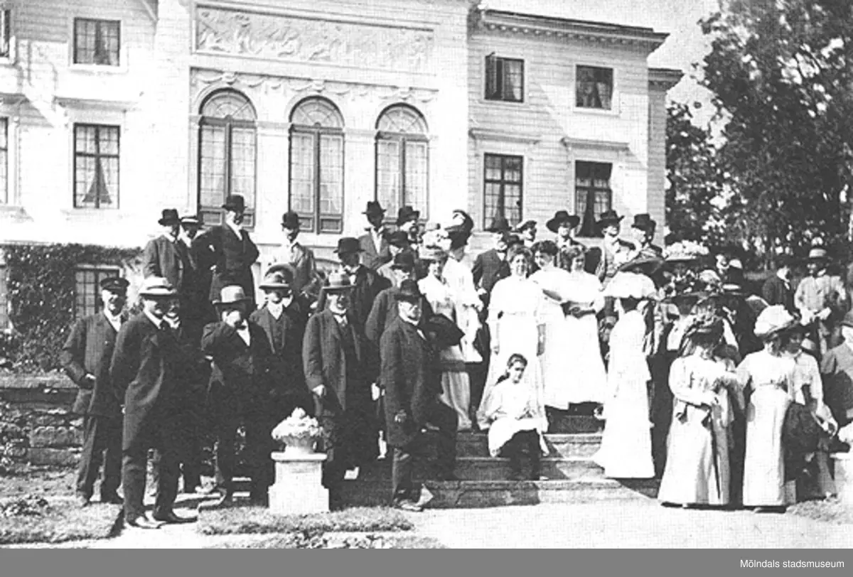 Svenska museimannaföreningen på Gunnebo den 16 juni 1911. I bildens mitt ses friherrinnan Hilda Sparre. Framför henne sitter dottern Margareta. Till vänster om dem och längst fram står Oscar Montelius.